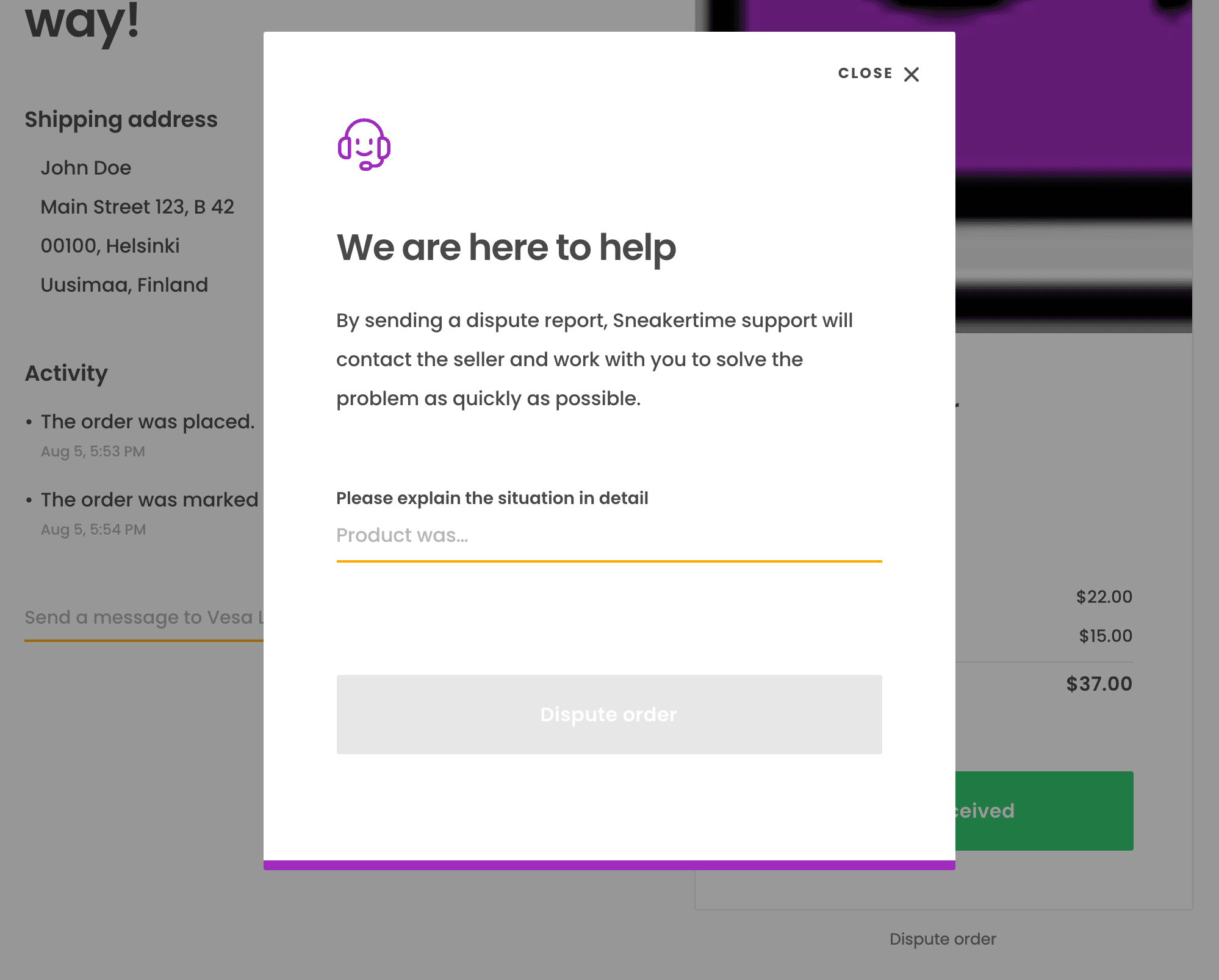 On TransactionPage (the page opened by clicking inbox items), the shipping address or pickup address is shown to both parties of the transaction. The provider has 2 weeks to mark the item shipped (transition/mark-delivered) or the automatic expiration happens (transition/auto-cancel) and the customer is refunded. If needed, the customer can dispute the order from the "Delivered" state.