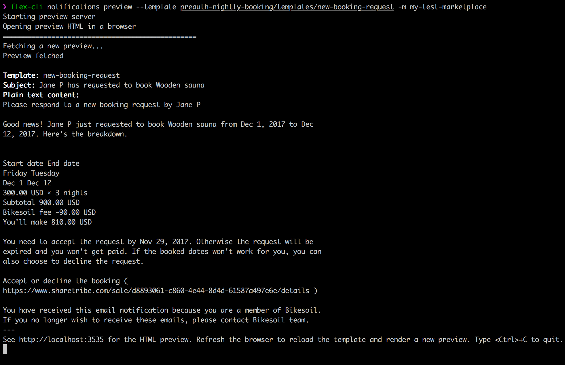 flex-cli notifications preview --template process/templates/new-booking-request -m my-marketplace-dev