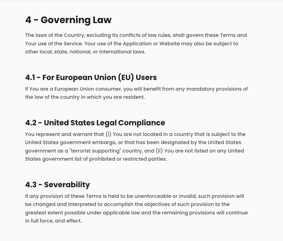 The Article template is best for written text, like a Terms of use page. Shown is a single Section of a Terms page using the article layout. Each heading is a different Block. Blocks are stacked one on top of the other.