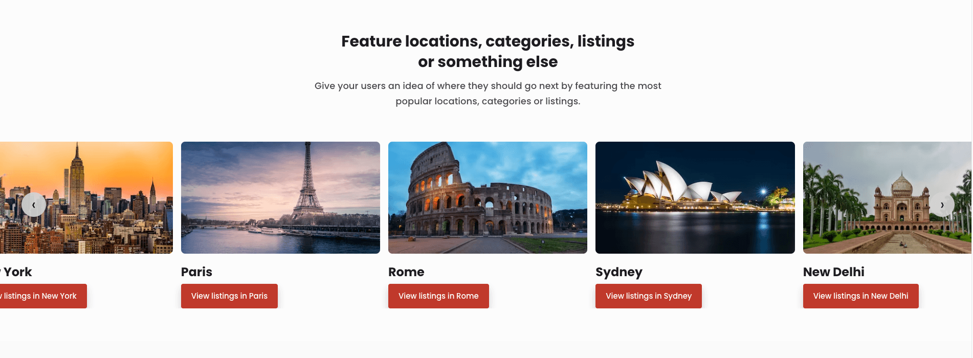 A Carousel example showcasing different locations. Each location is added as a Block with a title, image, and call to action button. The call to action button takes you to the search page with the location’s search parameters inputted, which exists at a unique URL generated by making the search. The carousel is scrollable left and right using arrows or by swiping.